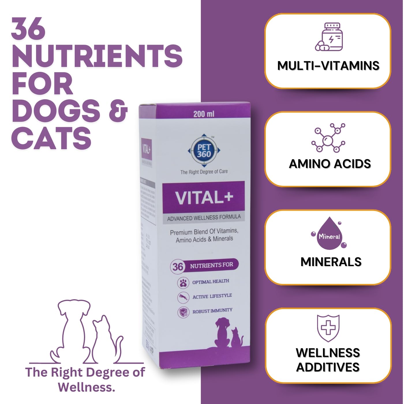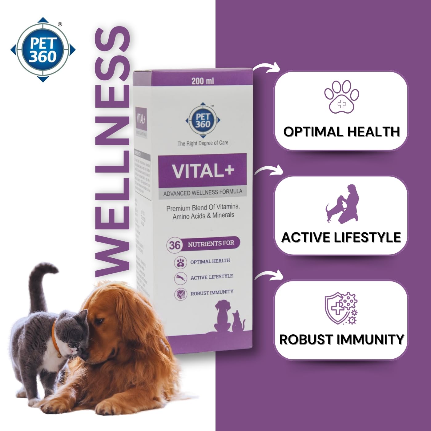 ENHANCED IMMUNITY & GROWTH: VITAL+ Advanced Wellness Formula by PET360 delivers 36 essential nutrients in a form of syrup, including multivitamins, amino acids, minerals, and antioxidants. Ideal for all breeds, this pet nutritional supplement supports overall health, growth, and immunty.